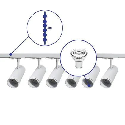 Beschrijving Complete Set 1-Fase Rail 3 Meter Wit | incl. 6x Spot + GU10 2700K 3W Dimbaar + Eindkap, Voedingsconnector en I-Verbindingsstuk