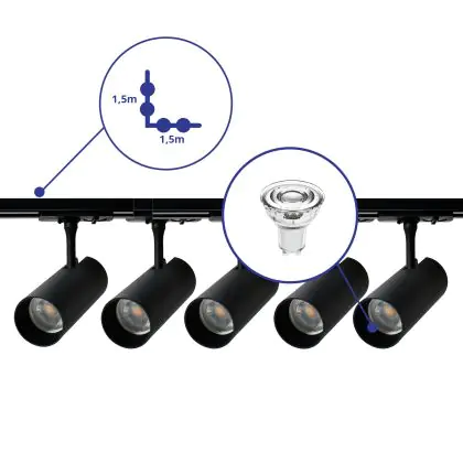 Beschrijving Complete Set 1-Fase Rail L 1,5 x 1,5 Meter Zwart | incl. 5x Spot + GU10 2700K 3W Dimbaar + Eindkap, Voedingsconnector en L -Verbindingsstuk