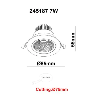 | Fabrikantnaam | White label LED Downlight Round Tiltable 7W 560lm 60D 930 UGR19 CutoutØ70mm FrameØ85mm | |