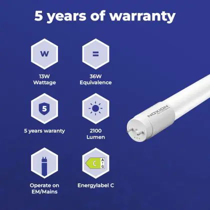 Deze Noxion LED TL buis heeft een Lumen / Watt efficiëntie van lm/W. Dit is de waarde die je verkrijgt door de lichtopbrengst (2100 Lumen) te delen door het wattage (13W) van deze lichtbron. Hoe weet je of jouw lichtbron een goede efficiëntie heeft? In dit geval ligt de lm/W waarde boven de 65. Je kunt er ook voor kiezen om een LED geïntegreerd TL armatuur te kopen. Hierbij heb je de keuze uit diverse (waterdichte) LED montagebalken, die in een divers aantal Lumen verkrijgbaar zijn. Een (dimbaar) LED paneel is ook een slimme optie, met name voor ruimtes met een systeemplafond (eenvoudige installatie) en kantoren (UGR<19 varianten).